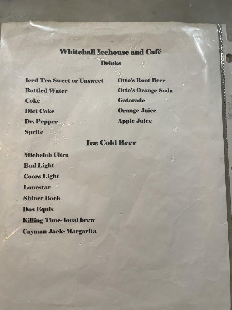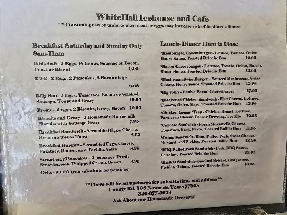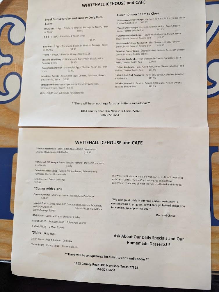 Welcome to Whitehall Icehouse & Cafe, your go-to hometown country café nestled in the heart of Navasota, TX. Enjoy a delightful dining experience with fresh, made-from-scratch dishes in a warm, Mom & Pop atmosphere. Our menu boasts mouthwatering BBQ, juicy burgers, and local beef, complemented by homemade desserts and daily specials. Bask in the beautiful scenic views from our ample outdoor seating while savoring breakfast on weekends or indulging in our karaoke nights. We cater to everyone with accessible amenities and fast service. Join us for lunch or dinner, and experience why we are a local favorite!
